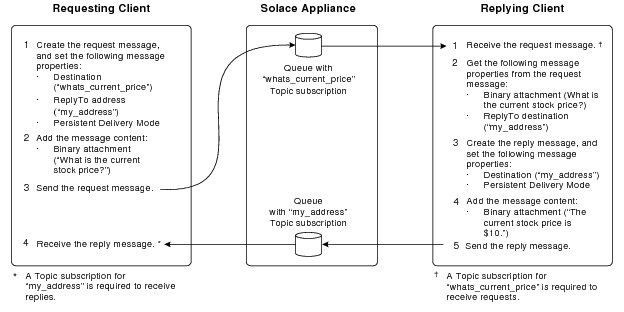 This section provides an overview of the basic steps that required to implement a request reply messaging model using Guaranteed messages. Note that client applications must use a mechanism to correlate the request message with the reply message. Using the CorrelationID message property is one possible mechanism to achieve that goal.