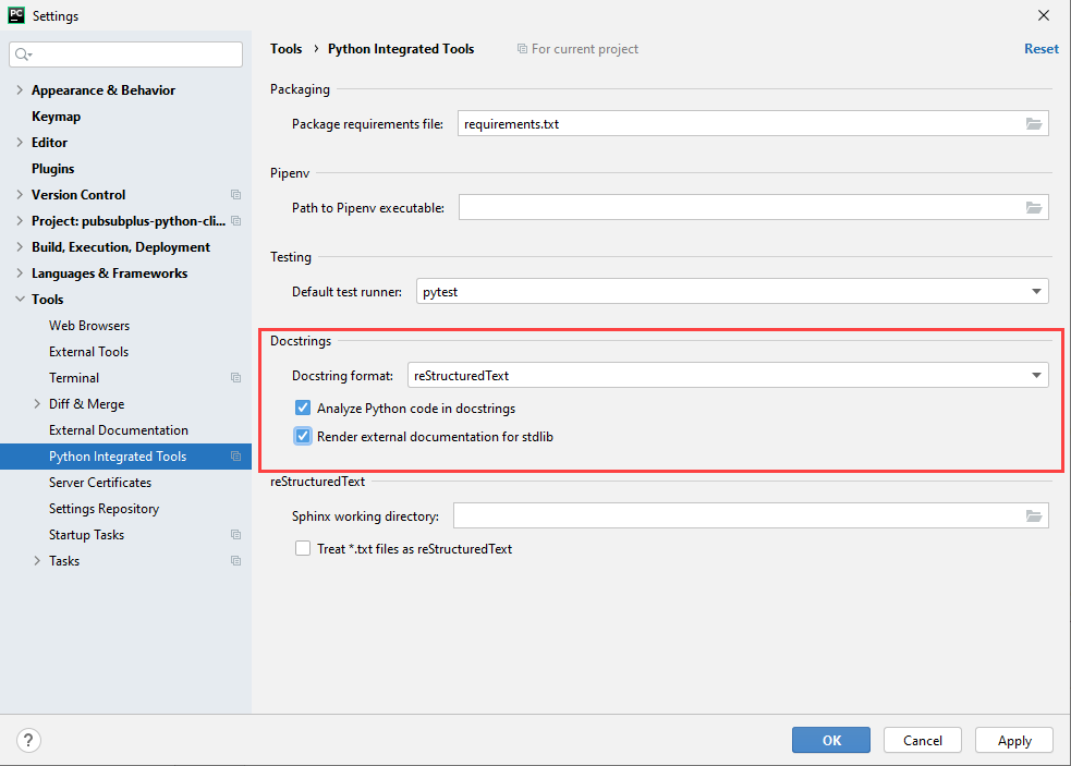 If you are using an Integrated Development Environment (IDE), such as PyCharm, integrated help is available, provided you have Docstrings rendered as reStructuredText. In some IDEs, you configure this in the settings. For example, in PyCharm, you go to File > Settings >Tool > Python Integrated Tools, select reStructureText in the Docstring format list, and click Apply.
