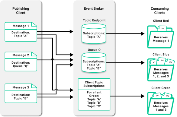 As shown in the figure below, when a topic subscription is added to a queue, it is possible for a message published to a topic to be sent to a queue, a topic endpoint, and directly to the message bus where it can be matched with clients’ topic subscriptions.