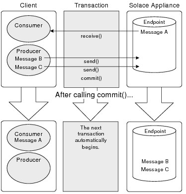 Messages that are published and received in a transaction are staged on the event broker. To complete all of the message send and receive operations in a transaction, the transaction must be committed. Alternatively, a transaction can also be rolled back so that all of its publish and receive operations are canceled. Once a transaction is completed, another transaction automatically begins.