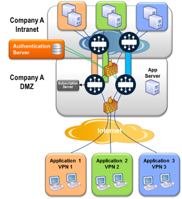 The following figure shows an example of three applications with server applications and web clients sharing the same DMZ and internal messaging infrastructure. Each application is deployed within its own Solace Message VPN which spans both the event brokers within the DMZ and the internal event brokers as a result of the Solace routing protocols.