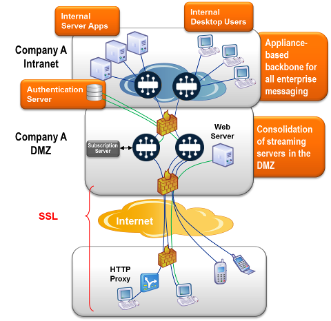 If transport security is required by the web application, Secure Sockets Layer (SSL) encryption is performed by the Solace JavaScript API using the facilities of the browser or mobile operating system. This SSL connection is typically terminated at the external firewall of Company A. This allows all internet security (for example, certificate management, Denial of Service (DoS) attack prevention, access controls) to be managed from a single point in the infrastructure (because messaging is typically just one of many internet services).