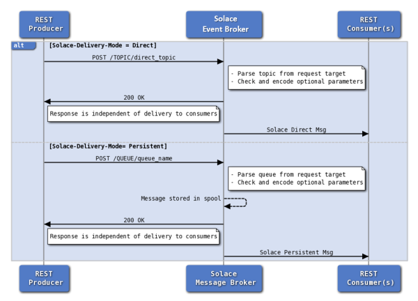 A synchronous reply message from the event broker to the REST producer is a Direct message. This means that the reply message is not placed in a persistent queue before delivery regardless of whether the request message was persistent or Direct. It is not necessary to persist the reply message because if a failure occurs in returning the reply (for example, if a Solace event broker activity switch or REST producer reset occurs), then the HTTP connection will fail so there is no way to return the reply to the request.