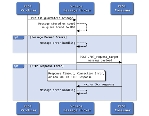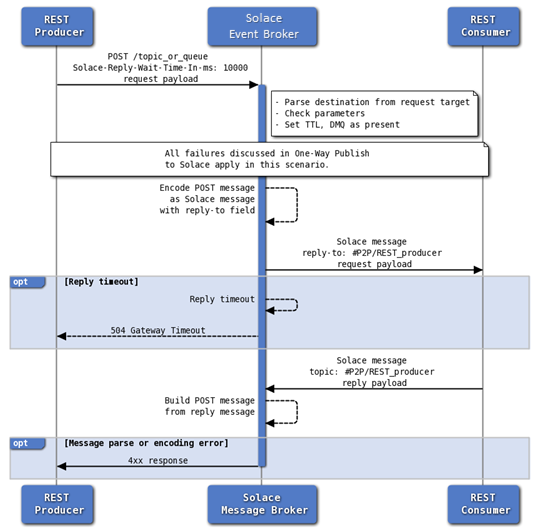 This message exchange pattern is a combination of REST Producer One-Way POST to Solace event broker and Solace event broker One-Way POST to REST Consumer. Therefore, the failure scenarios are a combination of these two scenarios and are not restated here.