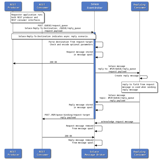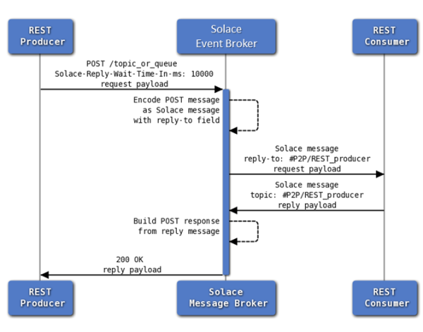 A REST consumer can encode any reply in the body of the 200 OK POST response that it returns to the event broker. If the originating Solace event broker request message contains a reply-to field, then an event broker reply message is generated with the body containing the contents of the 200 OK POST response. An empty 200 OK POST response generates an empty reply message. The event broker treats any such reply message as a direct message, though it may subsequently promote the direct message to a guaranteed message based on the reply-to queue or topic.