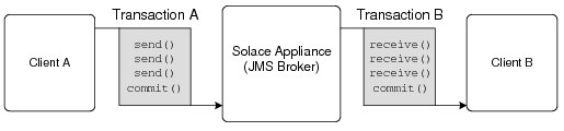 A transaction can only be used between a single client and the JMS broker; it cannot span multiple clients. For example, as shown in the figure below, client A can use a transaction to publish messages to a queue destination on the JMS broker, and client B can use a transaction to consume messages from the same queue. However, each client uses an independent Session, and each client must use a separate transaction. The JMS broker, as the place where messages are staged before they are published or consumed by a commit(), serves to separate client A’s production and Client B’s consumption of transacted messages.