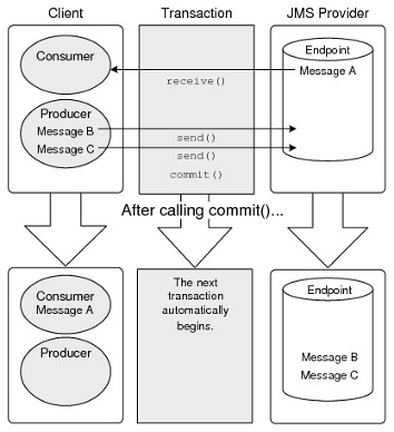 A client can use both a producer and a consumer in a single transacted Session. As shown below, in this case, when the client commits the transaction, spooled message A is received by the consumer from the endpoint, and messages B and C are published to that same destination endpoint.