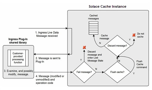 By default, the Solace Cache service facility caches all live data messages that it receives on a topic, subject to its configured constraints. However, the Ingress Message Plug-In can be used so that live data messages received for a topic can be inspected and then processed according to criteria defined in a shared library before a Solace Cache Instance caches or discards them. This allows only those messages that meet specific customer-defined criteria to be cached.