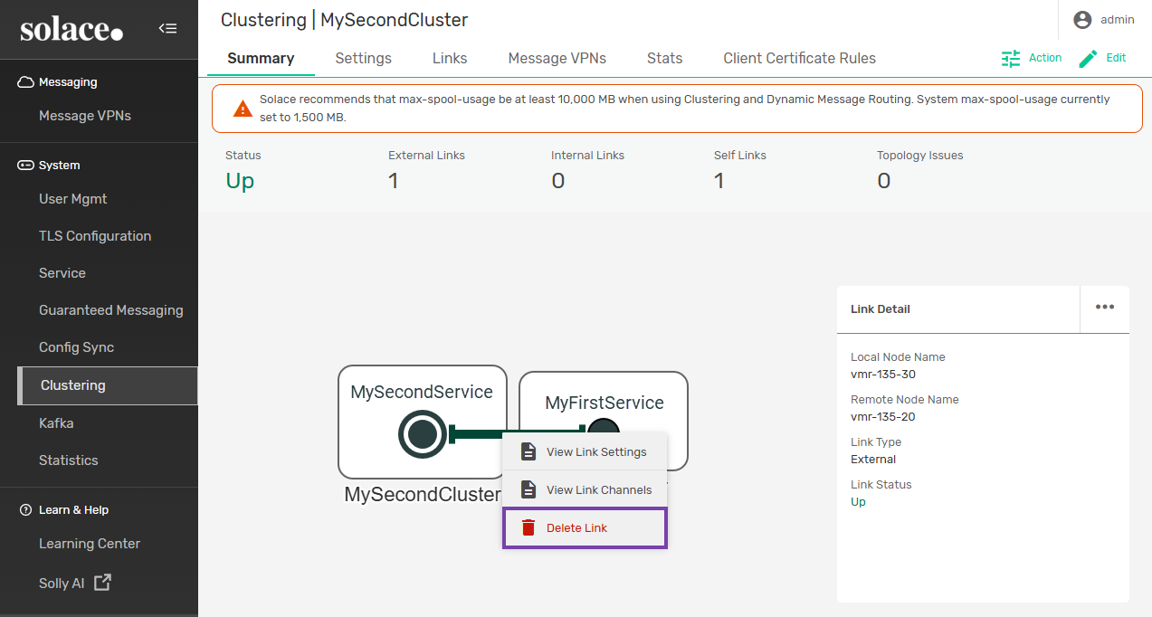 - If you do not delete the link from both nodes, the link will still be enabled and viewable on the summary page for one node, but it will not be operational.