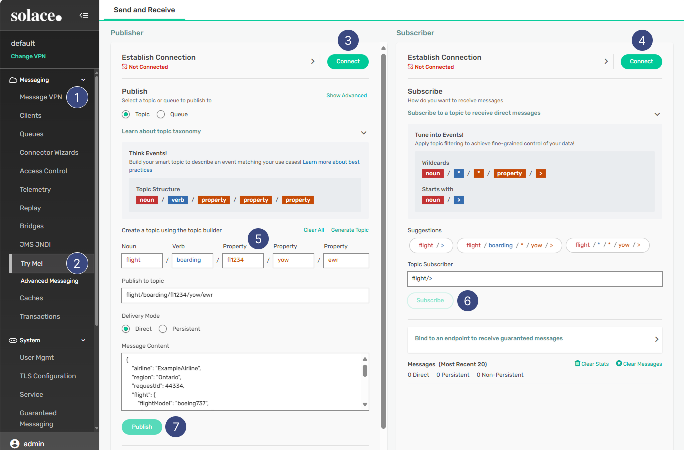 Broker Manager includes an integrated publisher and subscriber that you can use to test your event broker operation and configuration by sending and receiving test messages.