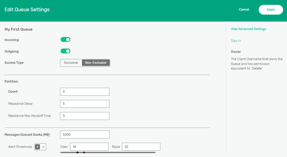 Set the appropriate options for the queue. For more information about queue settings, see Creating a Queue. To create a partitioned queue, set these options: