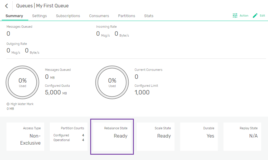 Wait for the event broker to allocate new partitions and complete Partition Rebalancing, that is, the Rebalance Status value for the queue is Ready.