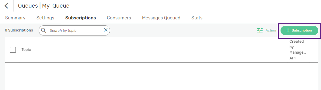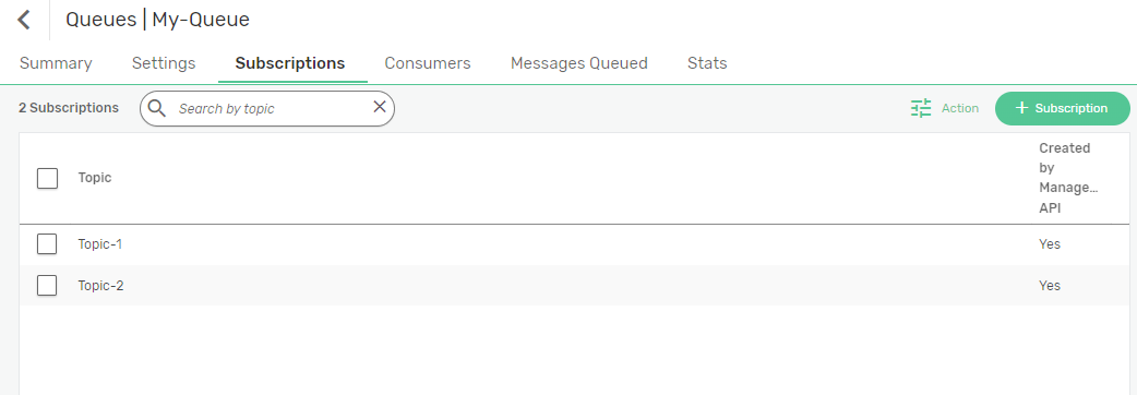 Subscriptions define the topics that queues receive messages for. Queues can have multiple topic subscriptions that attract published events. For more information, see Understanding Topics