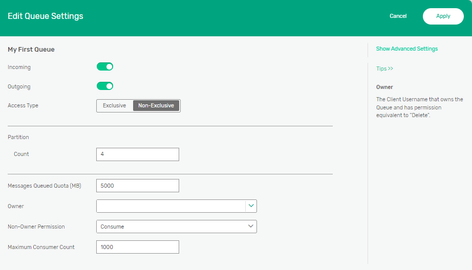 Maximum Consumer Countvalue of the queue is not exceeded, they will bind, but remain inactive until the active consumer is unbound and a new active consumer is chosen from the queue's inactive consumers. Exclusive queues always deliver messages in the order they are received. - Non-Exclusive specifies that multiple consumers can bind to the queue, which enables load balancing and consumer auto-scaling. A non-exclusive queue can be non-partitioned or partitioned.