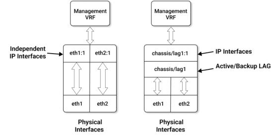 - For the management interfaces, a single LAG can be created with the two physical management network interface ports, where one interface is active and the other is the backup. See Active/Backup LAG Pairing for Management Interfaces.