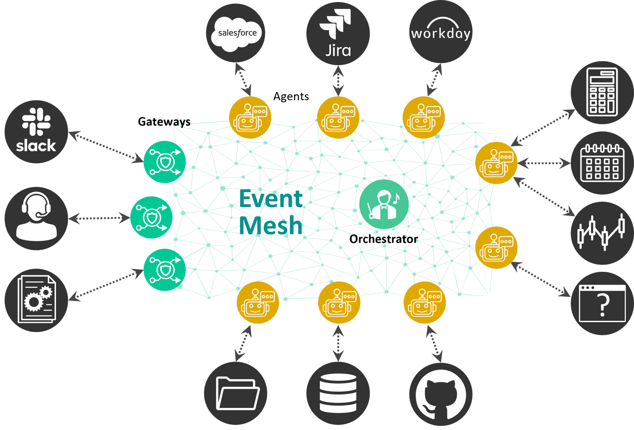 Gateways serve as controlled entry points into the framework, granting access to the agent ecosystem through different interfaces like MQTT, REST APIs, Slack, Microsoft Teams, etc. Gateways also handle authentication, authorization, and access control so agents can only interact with agents and data they are approved for.