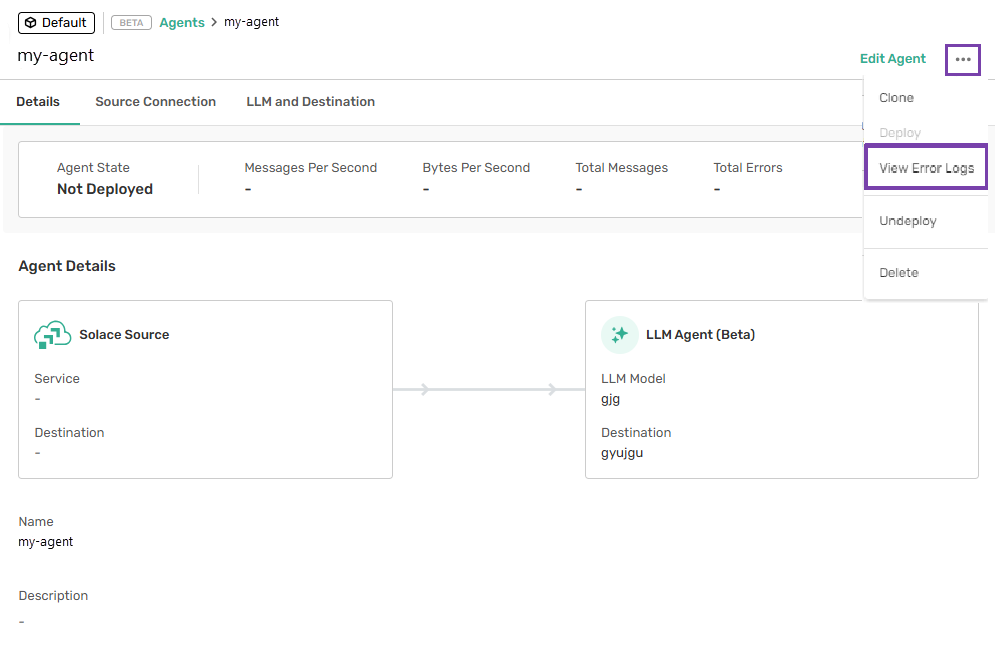 You can view the error logs for an Agent. The logs are useful for understanding problems that occurred while deploying the Agent and can provide you information to resolve the issue. Only the last ten error logs are available.