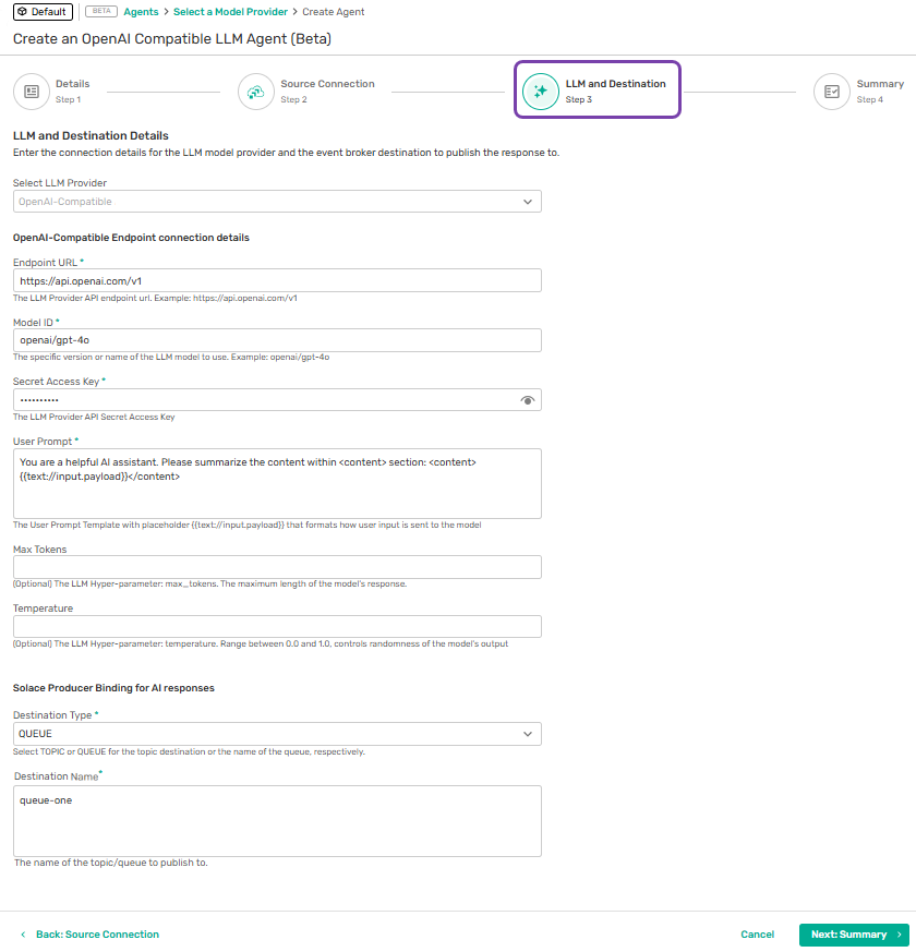 9. On the LLM and Destination step, enter the configuration details for your LLM and, if applicable, your vector database. For more information about the specific configuration for your model or vector database provider, see Configuring an LLM Agent and Configuring a RAG Agent.