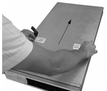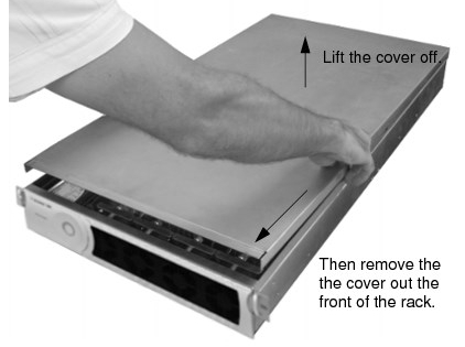 - Lift the cover off the chassis and then remove the cover out the front of the rack. Place the cover on a flat, stable, static-free surface where it will not be damaged.