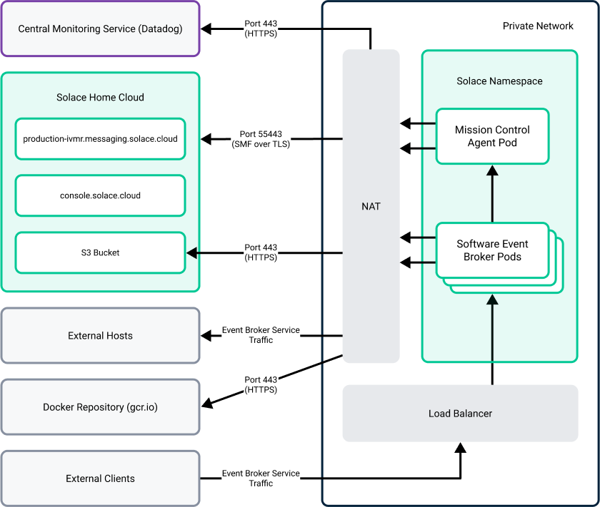 - This traffic carries communication required for proper functioning of the Kubernetes cluster and permits components of Solace Cloud to install, operate, and monitor event broker services). The installation of the Mission Control Agent requires this connectivity for communication with Solace Home Cloud.