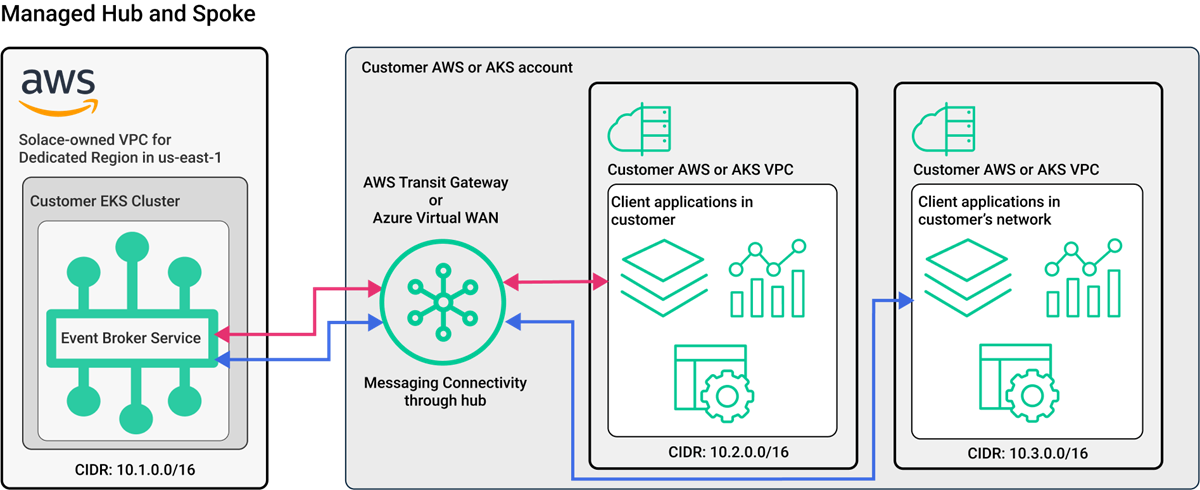 Solace recommends using unique CIDR ranges for your Dedicated Cluster and your networks when using managed hub-and-spoke for Messaging Connectivity.