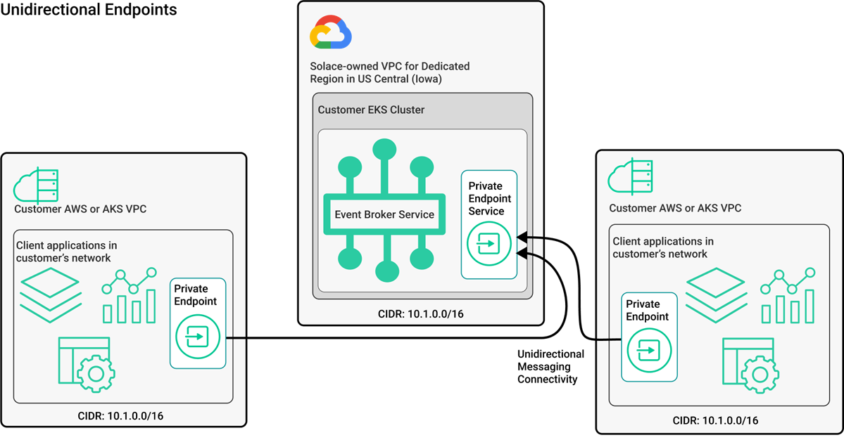 Google's version of uni-directional endpoints. Private Service Connect uses a private endpoint to expose an endpoint of the event broker service directly to your network. Messaging traffic travels through the endpoint, over the Google Cloud, and is not exposed to the public internet.