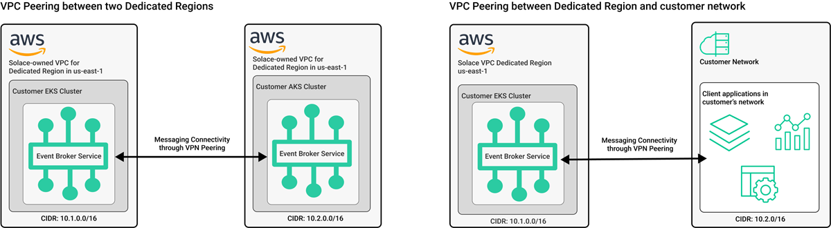 In Dedicated Clusters, we deploy the Mission Control Agent and event broker services in a region controlled by Solace. If you require private Messaging Connectivity between the event broker services in your Dedicated Cluster and the virtual private cloud (VPC) where your client applications reside, we offer several networking options supported by your chosen cloud provider.