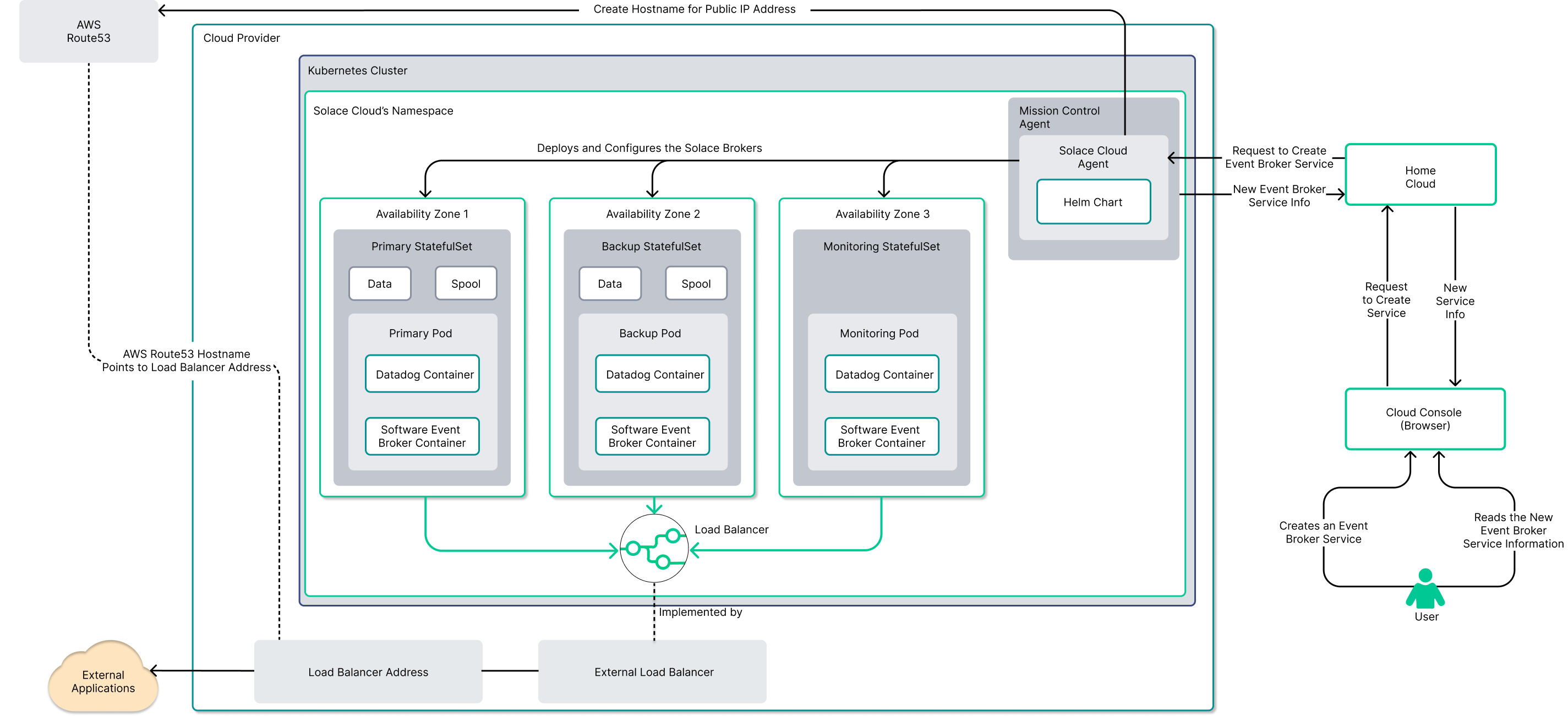 The following diagram shows the deployment architecture for Solace Cloud in Kubernetes environments.