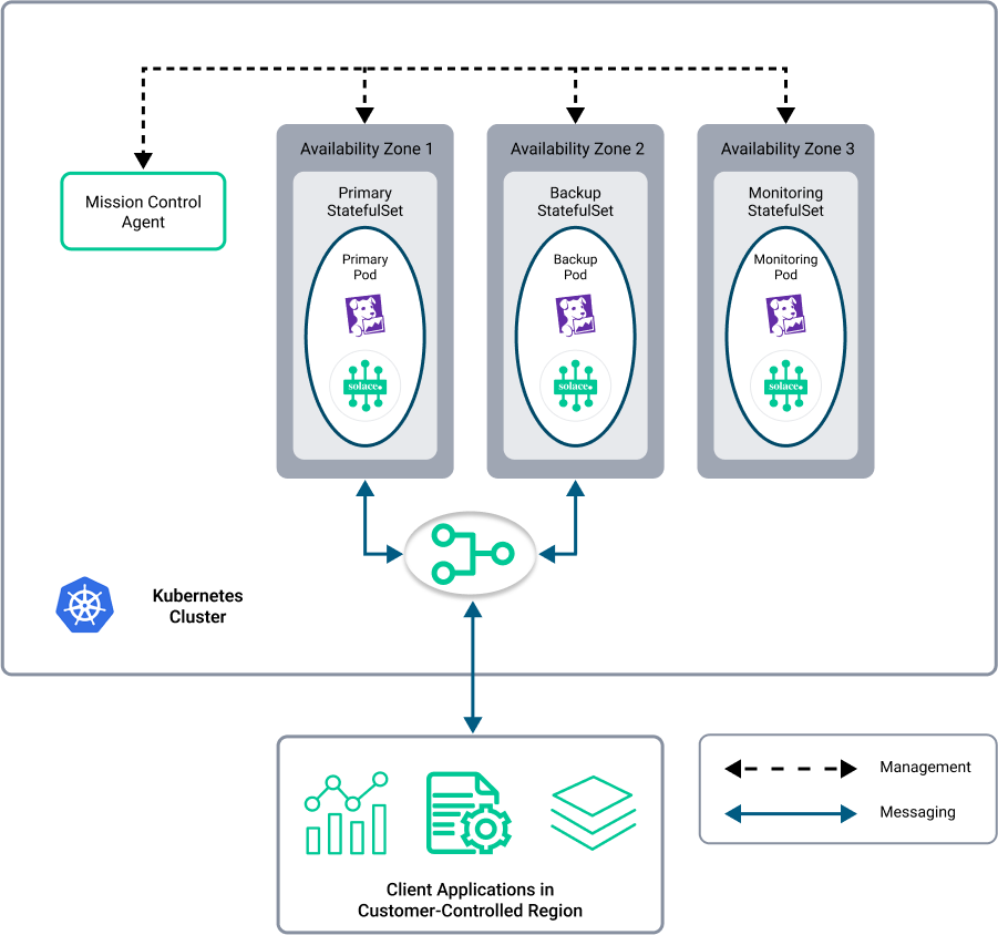 To ensure that high availability (HA) event broker services are properly provisioned, Solace Cloud requires three availability zones (AZs), one for each member of the HA triplet (primary messaging broker, backup messaging broker, and monitoring broker). For each HA service, the Mission Control Agent deploys the primary pod in one AZ, the backup pod in a second AZ, and the monitoring pod in a third AZ. This guarantees that pods for the same HA service are not running on the same hardware.