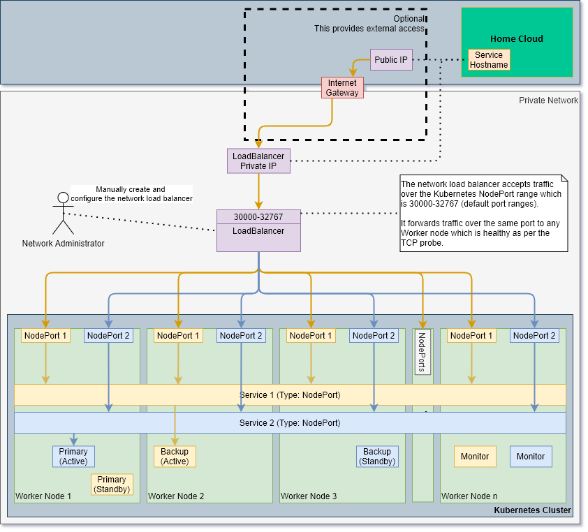 • Customers must manually provision a single load balancer in front of Kubernetes with a single address that receives the traffic for the cluster. This manual provisioning of a load balancer is typically done by a network administrator within the customer's private network. The load balancer forwards traffic to a default NodePort range of 30000-32767 (this can be modified on the API server if the --service-node-port-range setting is used to define the range), which is used by the Kubernetes cluster for its Target Pool. The load balancer's Target Pool should be configured to contain a list of the worker nodes within the Kubernetes cluster to ensure that traffic is routed reliably. This network load balancer will also need to be mapped to an IP address which clients outside of the Kubernetes cluster can reach.