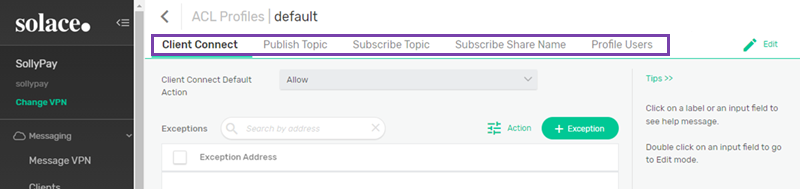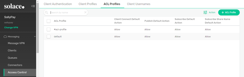 These properties are set to Allow when the ACL profiles are generated during service creation. If you set these properties to Disallow, the health checks you perform on your event mesh will fail. You can configure the ACL profiles in Broker Manager on the Access Control tab.