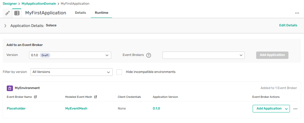 You can filter the list of event brokers on the Runtime tab to view the event brokers that an application can be added to or that an application or specific version has already been added to.