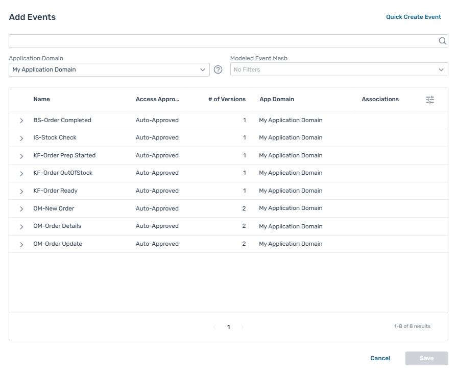4. (Optional) In the Modeled Event Mesh list, select a modeled event mesh and environment to list only event versions published in the selected modeled event mesh.