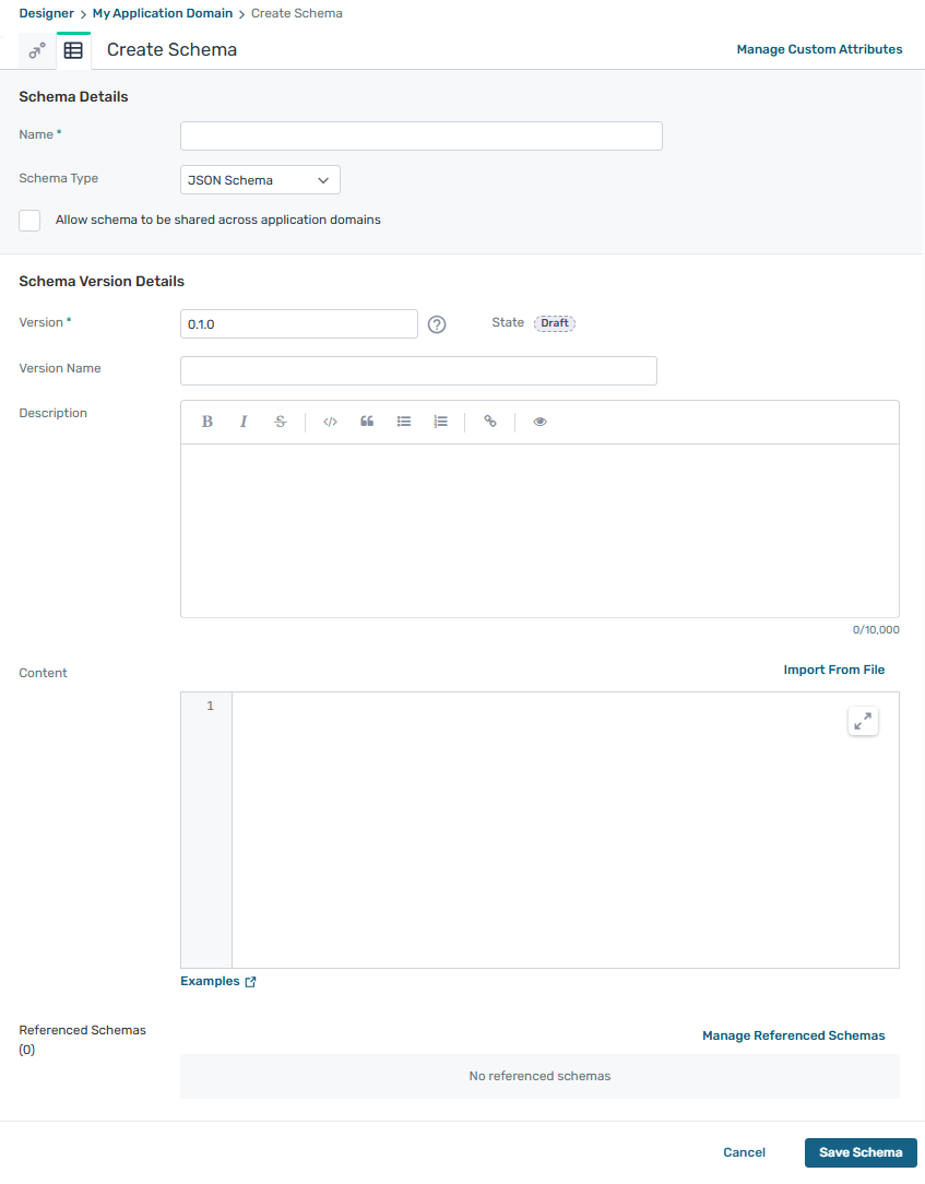 4. If it's not already part of the schema definition, in the Content field, add a reference to the schema. For example, in a JSON schema, add "schema_parameter": { "$ref": "/path/referenced_schema" } for a schema parameter that references another schema.