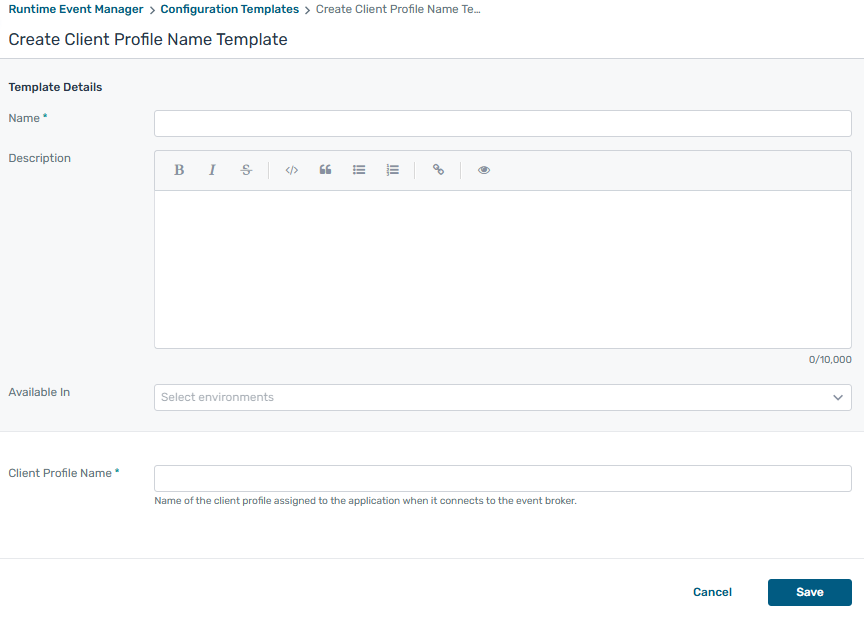 You can create client profile name templates to allow users to select the name of the client profile that the application should use on the event broker. You should only create templates for the names of client profiles that exist on your event brokers. If you name a client profile that does not exist on the event broker, pushing the configuration to the event broker fails. For more information about creating and using client profiles on event brokers, see Using Client Profiles and Client Usernames.