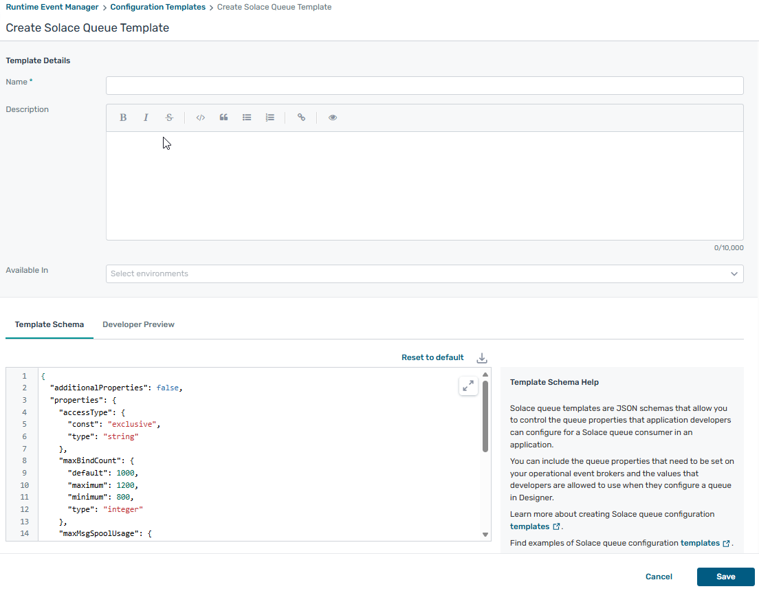 If you select one or more environments that the template is available in, the template can be used in applications added to the specified environments when a Solace queue template is required. The template can be used in all environments that don't require the use of templates.