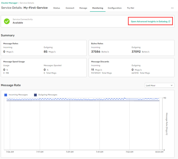 You can configure access to the monitoring data in Datadog with a subscription to Insights. Access to Insights provides you with valuable information to manage and get insights into your event broker services. With direct access to Datadog, you can customize and build your own dashboards to higher levels of granularity that may better suite your use case and requirements.