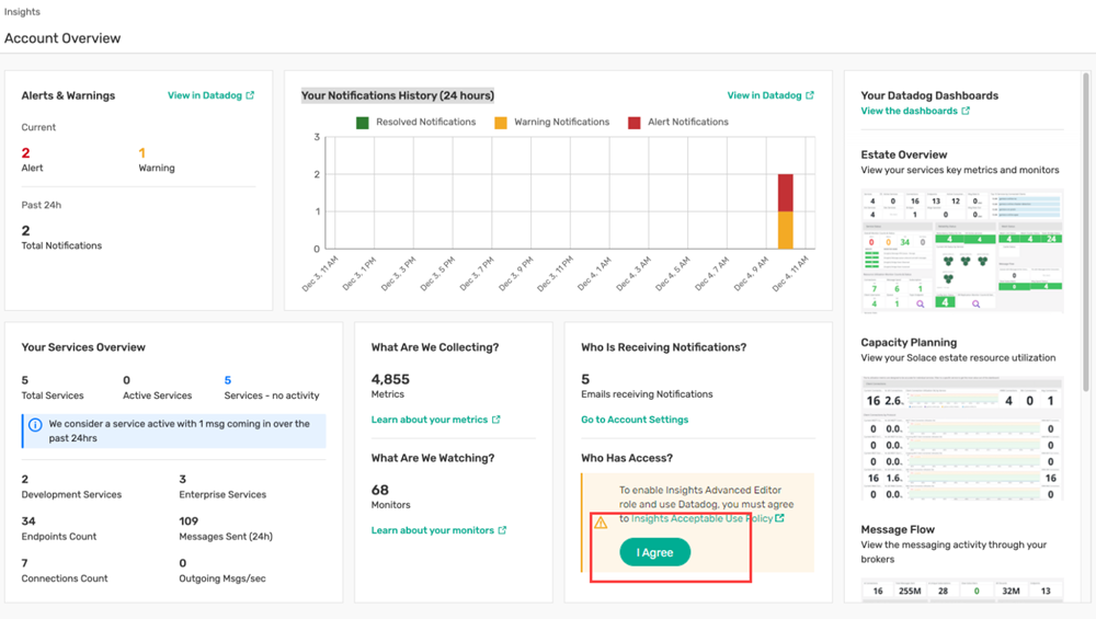 You can view the Insights AUP from the Solace InsightsAccount Overview page. The named Administrator accepts the AUP by clicking I Agree. Accepting the AUP allows the Administrator to grant access to the Datadog account that comes with Insights. You only need to accept the AUP once per Solace Cloud account.