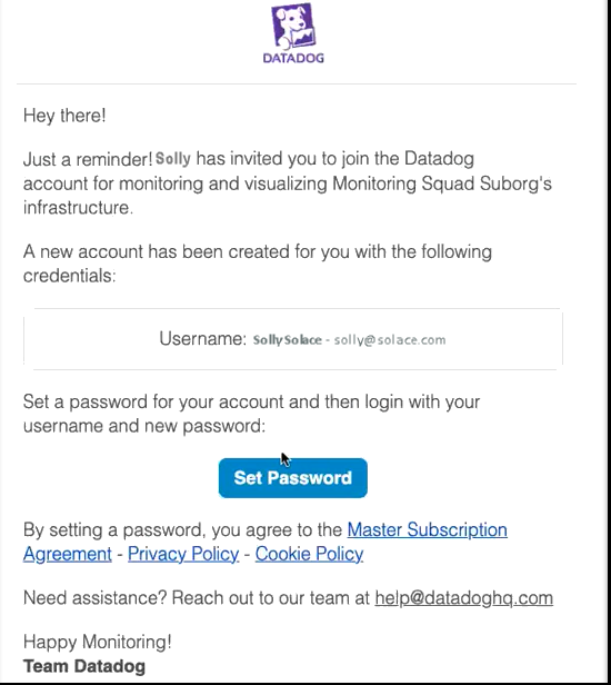 • If you previously did not have a Datadog account, the invitation email that you receive will indicate to click Set Password to set up your new Datadog account. To do this, follow these steps: