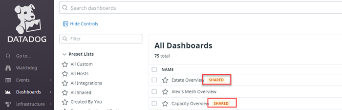 Any dashboard that is being shared is indicated as such in the list of Dashboards in Datadog with a SHARED icon, as shown in the image below:
