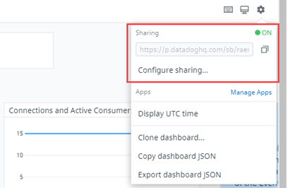 For dashboards with sharing enabled, the menu accessed by clicking the gear icon acquires a Sharing section. The Sharing section indicate the shared status of the Dashboard. You can also copy the URL from this section, and click Configure sharing to access the Sharing window.