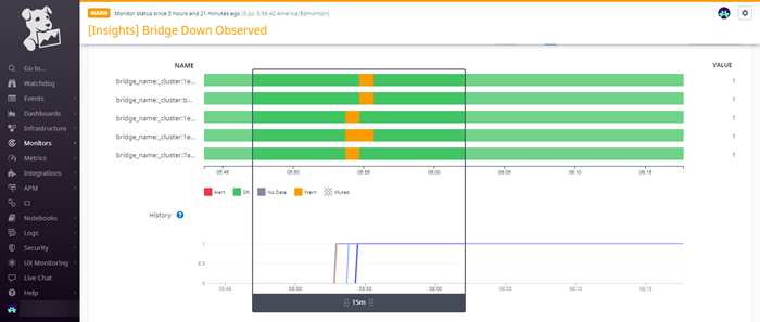 The screenshot below shows an example of how a monitor status and history may appear in Datadog.