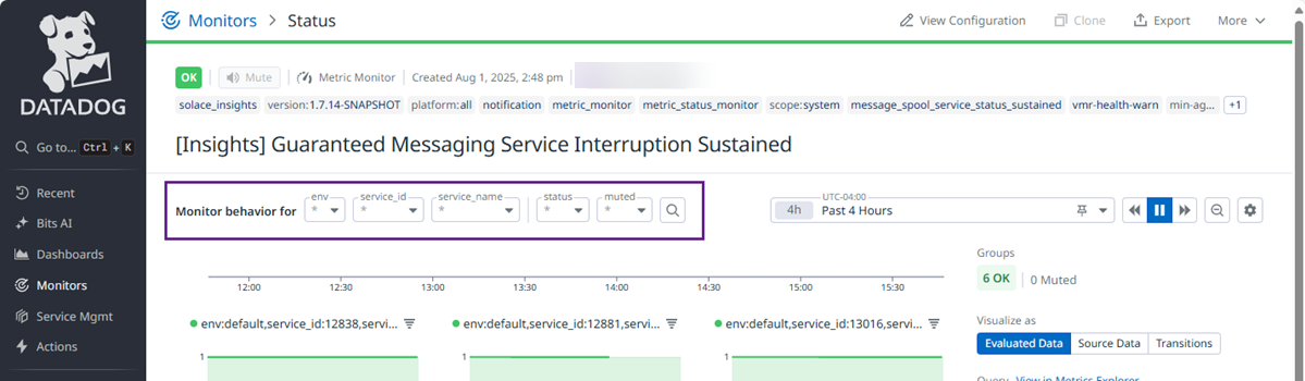muted- Allows you to filter the monitor by the muted state of the monitor. For more information, see Muting Solace Insights Monitors for Datadog.