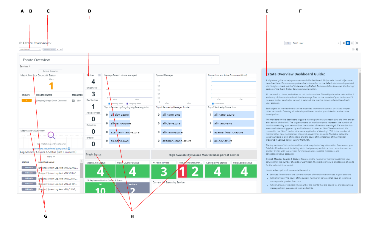 You can use the Solace Insights dashboards as is, but based on your monitoring needs, you can also create your own Solace Insights dashboards in Datadog. You can even choose to use a mix of predefined dashboards and custom dashboards to monitor your estate. An estate refers to your deployment of event broker services, the messaging and activities that occur, and any capabilities that are part of your account for Solace Cloud (Workspace).