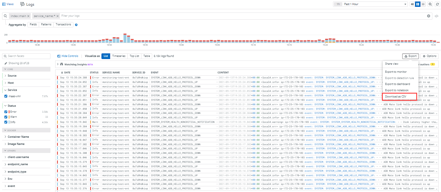 how to export the logs to a CSV file. For more information, see Log Explorer in the Datadog documentation.