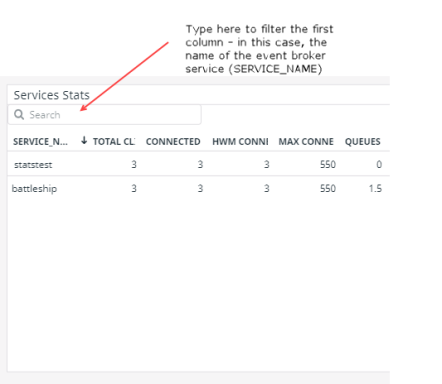 All tables on this dashboard show up to 100 rows. All table interactions are for the entire set of possible rows. You can click on the column headers to sort the entire list and show you the top (or bottom) 100 rows based on the sorted metric. You can also type in the Search field to filter the results. For example, in this summary table, you can filter by the name of the event broker service.