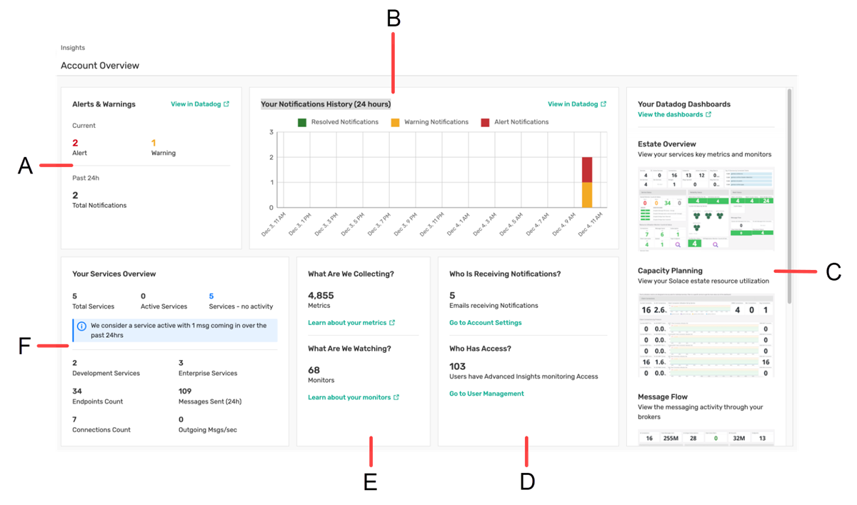 The Solace Insights Account Overview dashboard provides an overview of Insights for the account that you are logged into. Specifically, the Account Overview dashboard gives you: