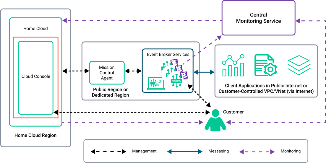 The Cloud Console is a web-based user-interface that you access from a public Internet connection. You have an account that permits you to manage users and to configure access to your event broker services. The Cloud Console has a 99.95% uptime and data backups are taken every four hours.