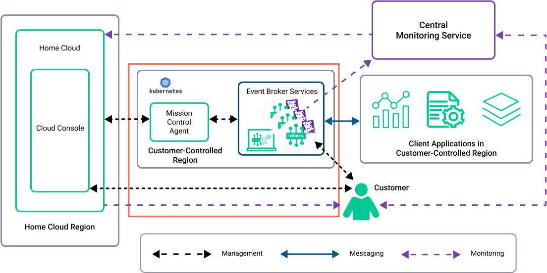 You can deploy your event broker services in a Kubernetes cluster in an isolated virtual private cloud or virtual network (VPC/VNet). An isolated VPC/VNet is recommended when you need additional security and want to keep your event broker services entirely separated from other enterprise applications/services and environments to limit risks and the vectors of attack. This may be an important consideration since the Mission Control Agent is given limited permissions to communicate with the Solace Home Cloud.
