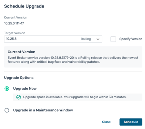 • You can only upgrade one event broker service at a time using an immediate upgrade if an upgrade slot is available. You can see availability using the Schedule Upgrade window in the Cloud Console. If there is no availability, you can try again at a later time. For more information, see Performing Self-Serve Upgrades for an Event Broker Service Using the Cloud Console